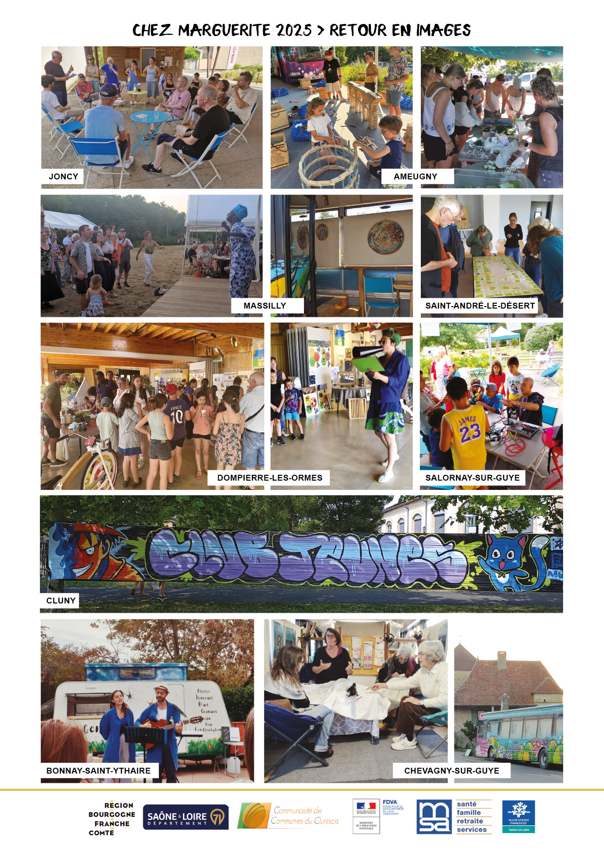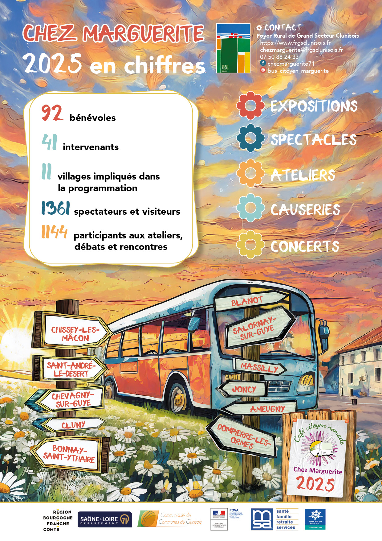 Tout au long de l’année 2025, le bus citoyen Chez Marguerite, porté par le Foyer Rural de Grand Secteur Clunisois, a sillonné les villages pour aller à la rencontre des habitantes et habitants. Expositions, spectacles, ateliers, débats, rencontres intergénérationnelles…